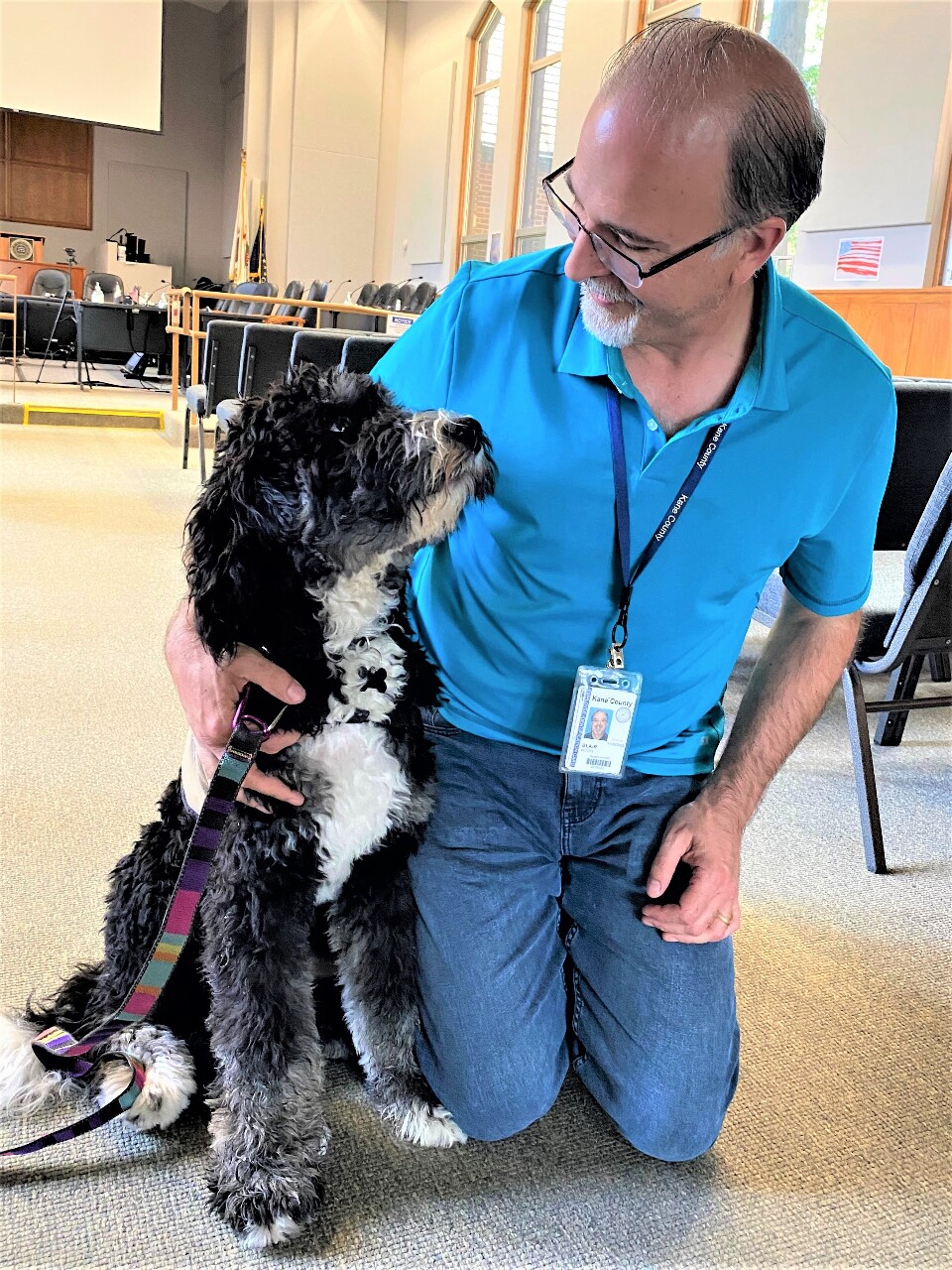 Frisbee, a 7-month-old Bernese Mountain/Poodle mix, tags along with Kane County Technologies Coordinator Blair Peters during his workday.