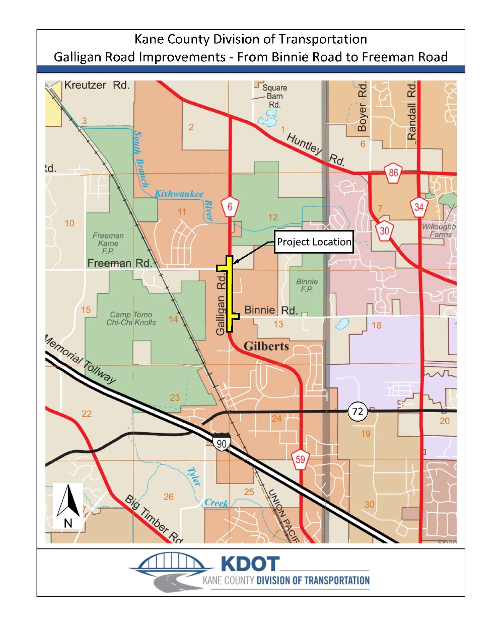 Project information can also be found on the KDOT website (https://kdot.kanecountyil.gov/Pages/Projects/Galligan%20Road%20-%20Binnie%20to%20Freeman/Galligan-Road-from-Binnie-Road-to-Freeman-Road.aspx)