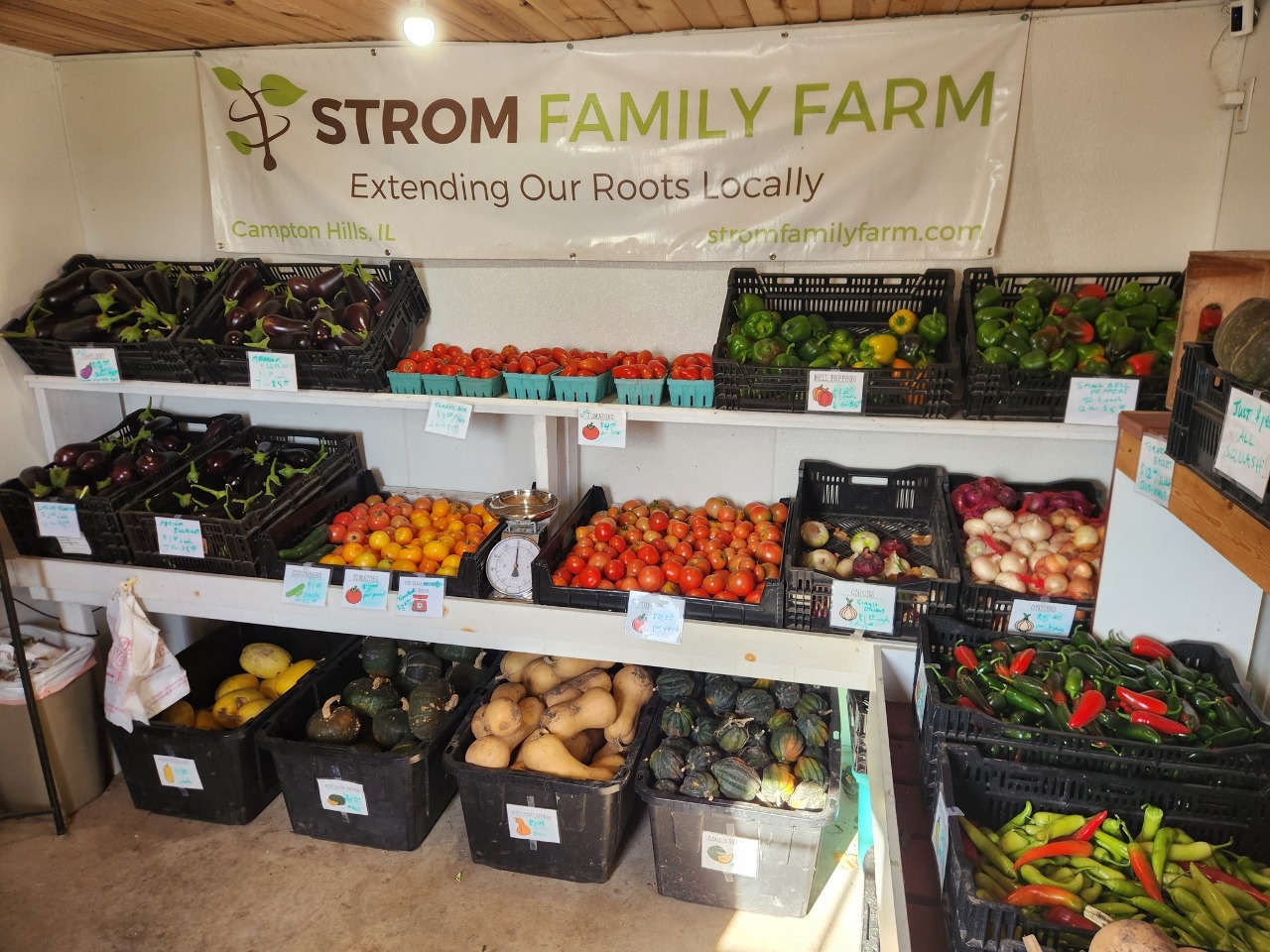 While Strom Family Farm began as a modest operation for friends and family, it has evolved into a diversified farm providing produce and honey to the wider Kane County public. At the farm store, customers can find tomatoes, onions, peppers, eggplant, squash, potatoes, beets, scallions, Brussels sprouts, kale, spinach, garlic, pumpkins, beans, radishes, cucumbers, carrots, watermelons, cantaloupes, herbs, and of course, sweet corn.