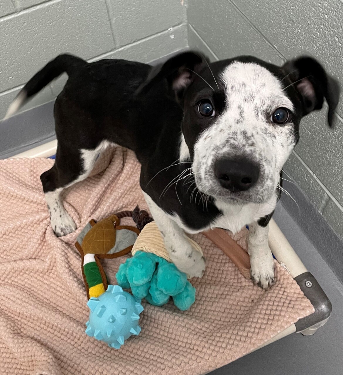 And Mitzi, who is a 4-month-old spayed female, black and white Australian Cattle Dog-mix, absolutely loves squeaky toys and balls. She has a face that is offset by two deep brown eyes and a white speckled nose that wants to sniff everything! In fact, if you're not careful, Mitzi will just walk in front of you to sniff out whatever smell she's hunting down.