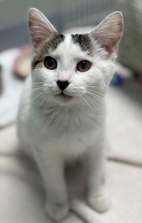His wide-eyed innocence coupled with his golden eyes immediately pulls you in to his personal space and suddenly, there is nothing else in the universe that exists except little Mothman, a 5-month-old white and brown neutered male Domestic Shorthair.