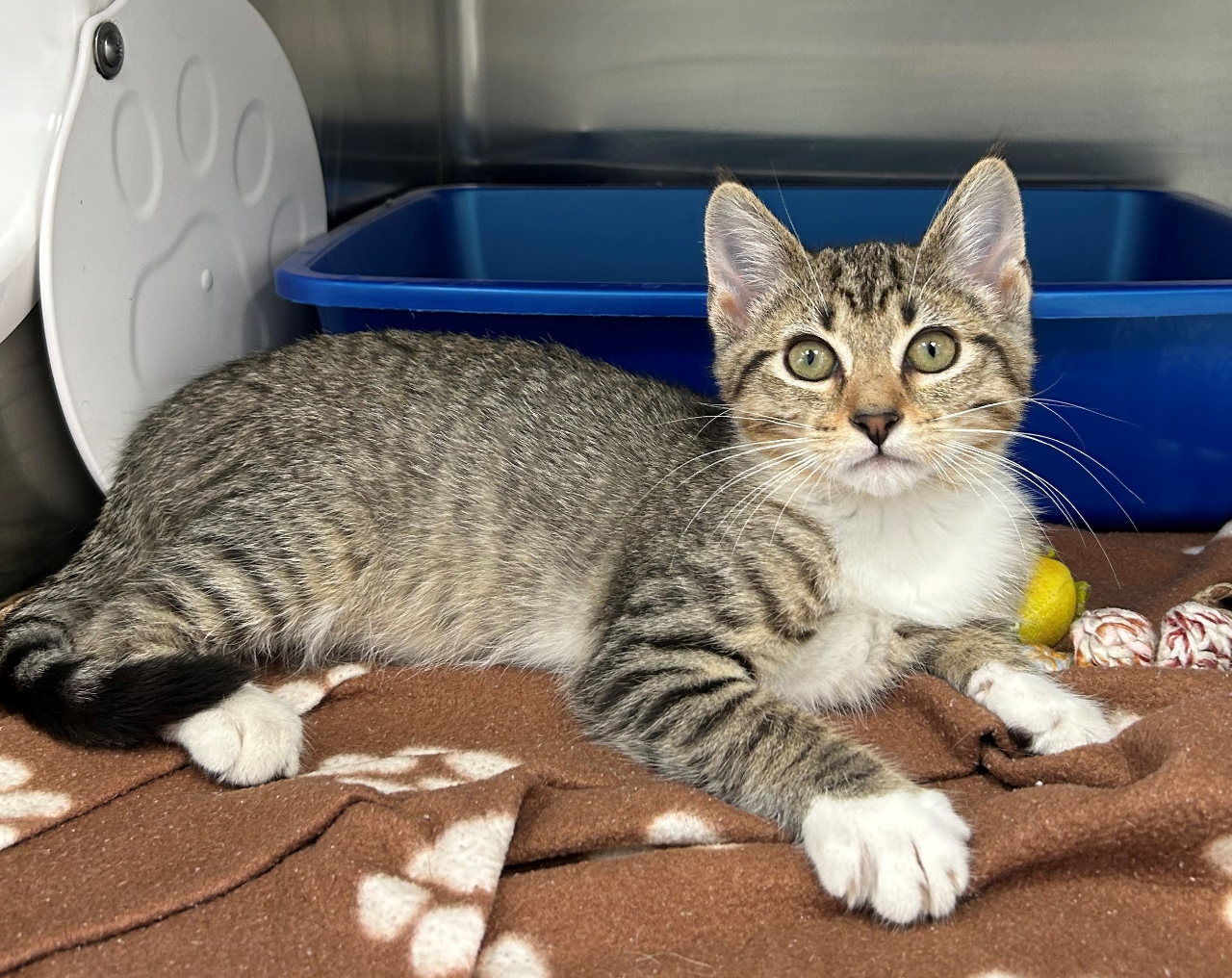 Her white chest and brown and tan tiger markings make it seem as though she should have relatives living in a tropical rainforest in Indonesia. Her entire “outfit" of fur is offset by white paws which add just the right amount of contrast. Dress her up in a scarf or small vest made for cats and, right away, the next model sensation is ready to strut her stuff on a runway.