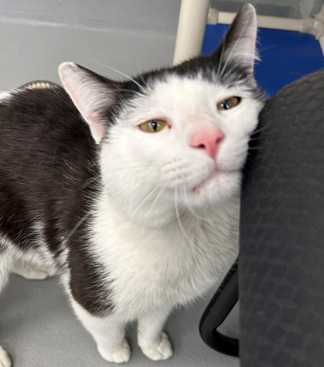 He looks a little like a cartoon cat with his white face and black receding fur around his ears. His pink nose stands out on a face that resembles a caricature of feline features. His gold eyes try to make eye contact with whoever is in the room with him as he boasts about his many lives.