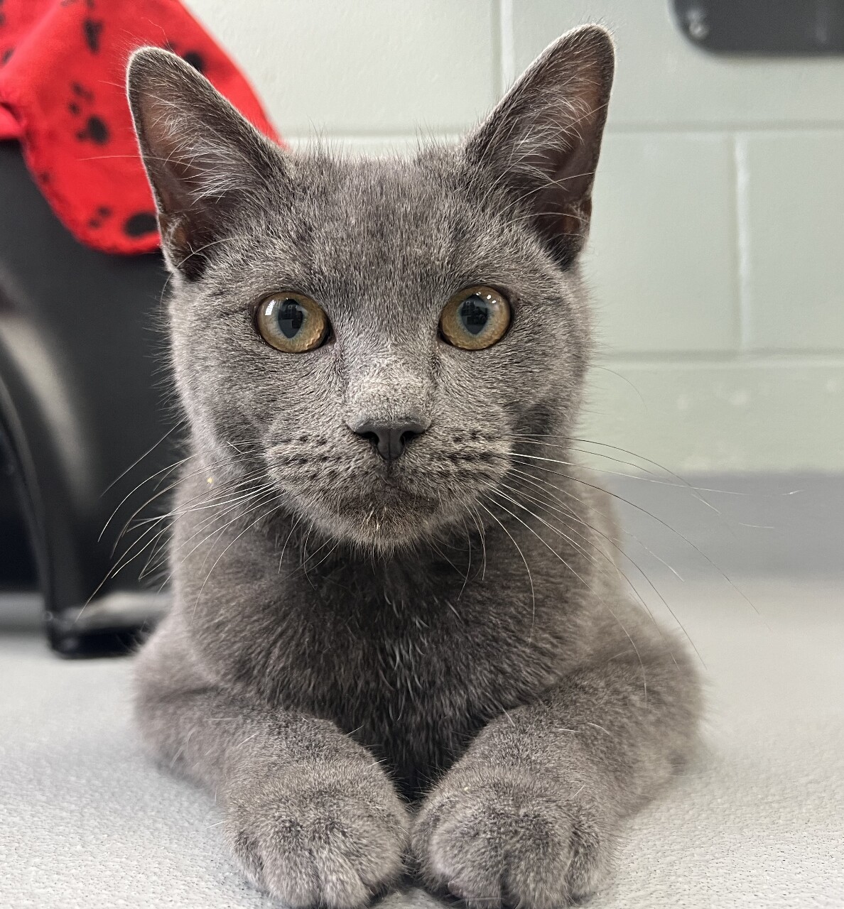 He's cute as a button with the classic look of a gray panther, but his golden wide eyes give him away. That's when you know he's just a kitten, a baby wanting to act all grown up.