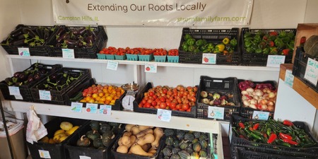 While Strom Family Farm began as a modest operation for friends and family, it has evolved into a diversified farm providing produce and honey to the wider Kane County public. At the farm store, customers can find tomatoes, onions, peppers, eggplant, squash, potatoes, beets, scallions, Brussels sprouts, kale, spinach, garlic, pumpkins, beans, radishes, cucumbers, carrots, watermelons, cantaloupes, herbs, and of course, sweet corn.