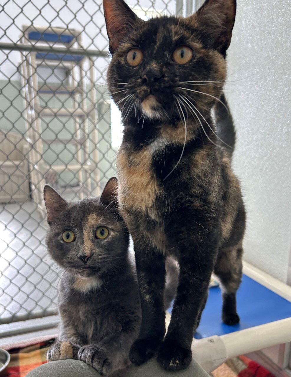 Two feline sisters bonded together for good times and bad, looking to each other for support and comfort. Both girls are torties, both are 6-months-old and both are almost mirror images of each other when it comes to their playful antics and energy levels.