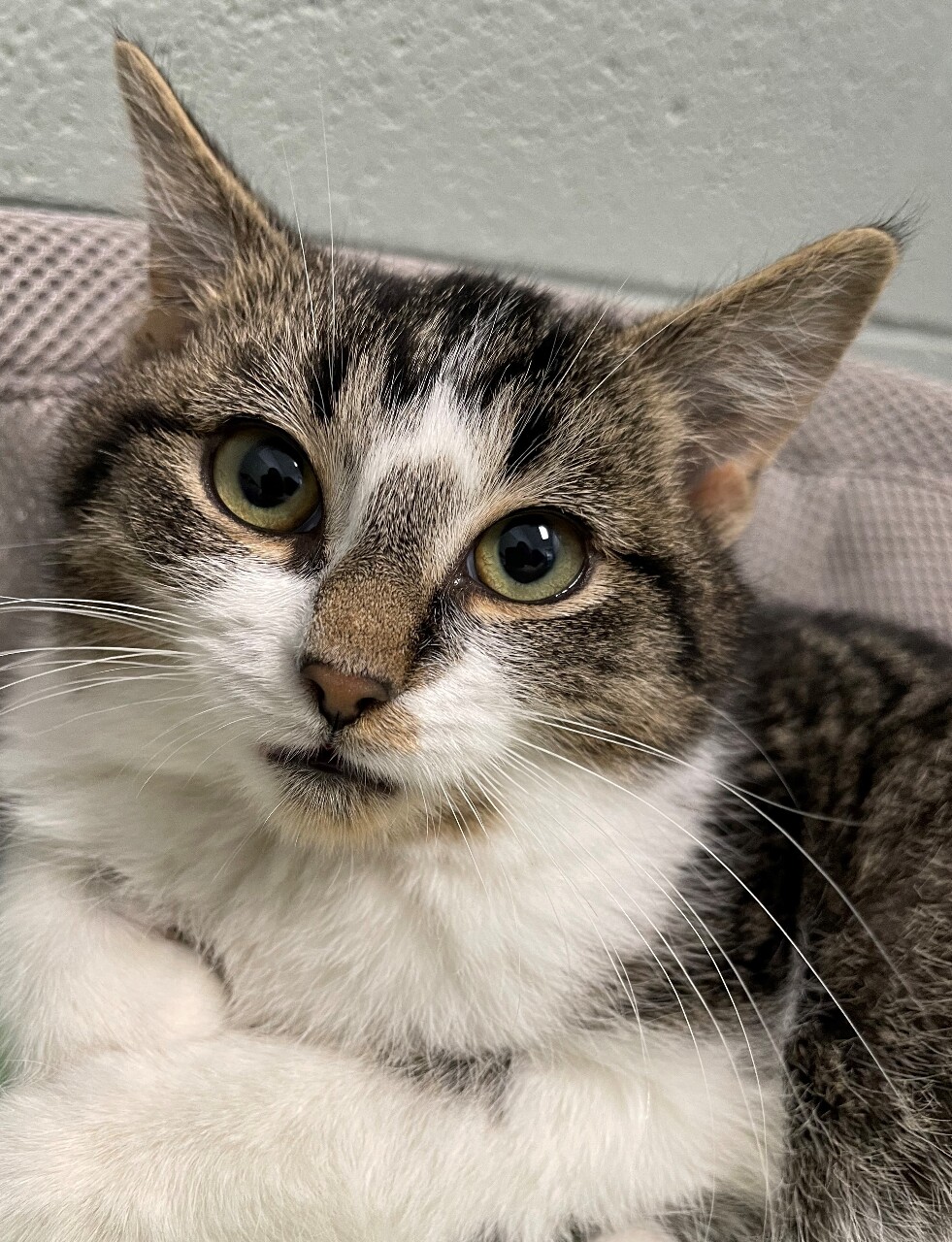 Butch will answer you with a “mew” if you call his name. Keep saying his name and he will answer you each time. Keep talking and Butch will try to catch up on the conversation. You’ll never be alone with tiny Butch in the house.