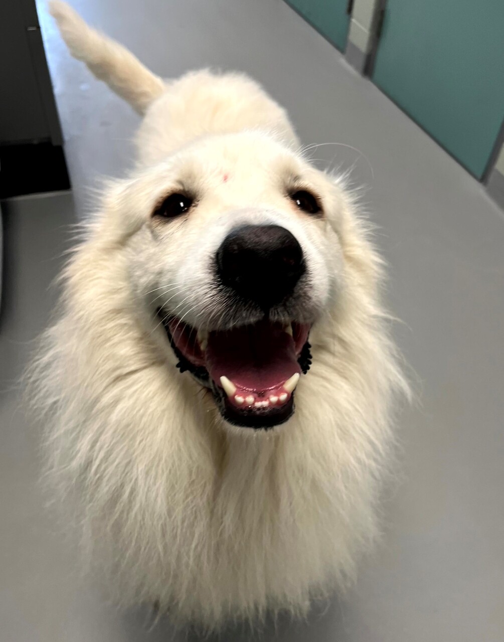 He's definitely the only Great Pyrenees in the room, so it's hard not to miss him, especially when he turns on the doggo charm by giving everyone his million dollar smile.