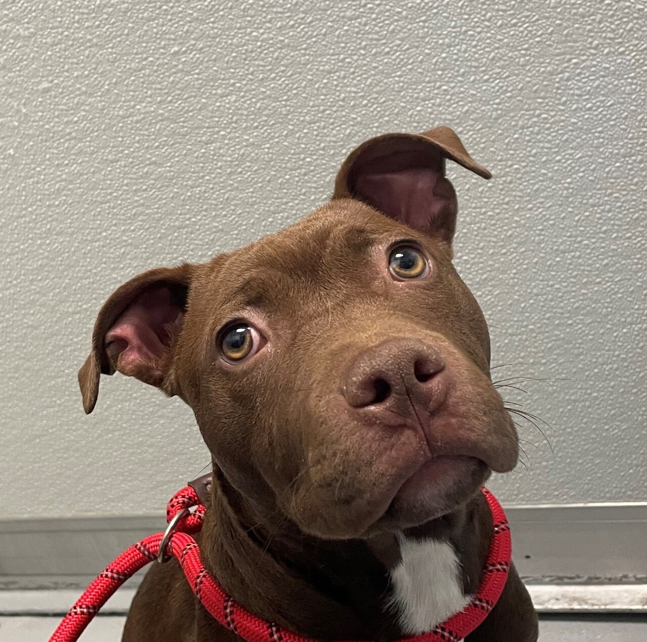 A brown and white Pit Bull-mix, she is lucky she has a “squishable" face, one that is just waiting to be smooched and kissed and hugged. She already is very smart because she can give paw when asked and she knows how to sit on command.