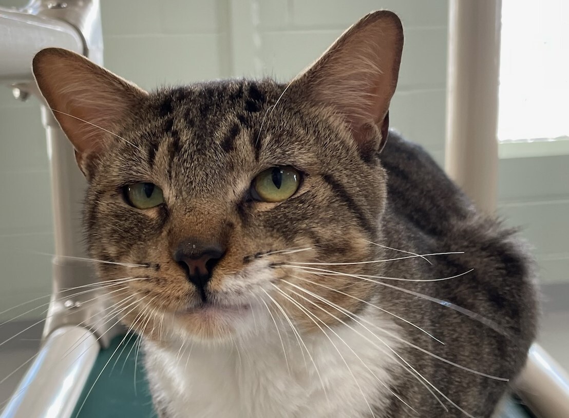His name is Lynja and he's a brown and white tabby, a Domestic Shorthair that gazes at everyone with an off-kilter stare. That's because one eye is a little more squinty, a little less open than the other one, probably due to being a stray, living on the streets for a while during part of the winter.