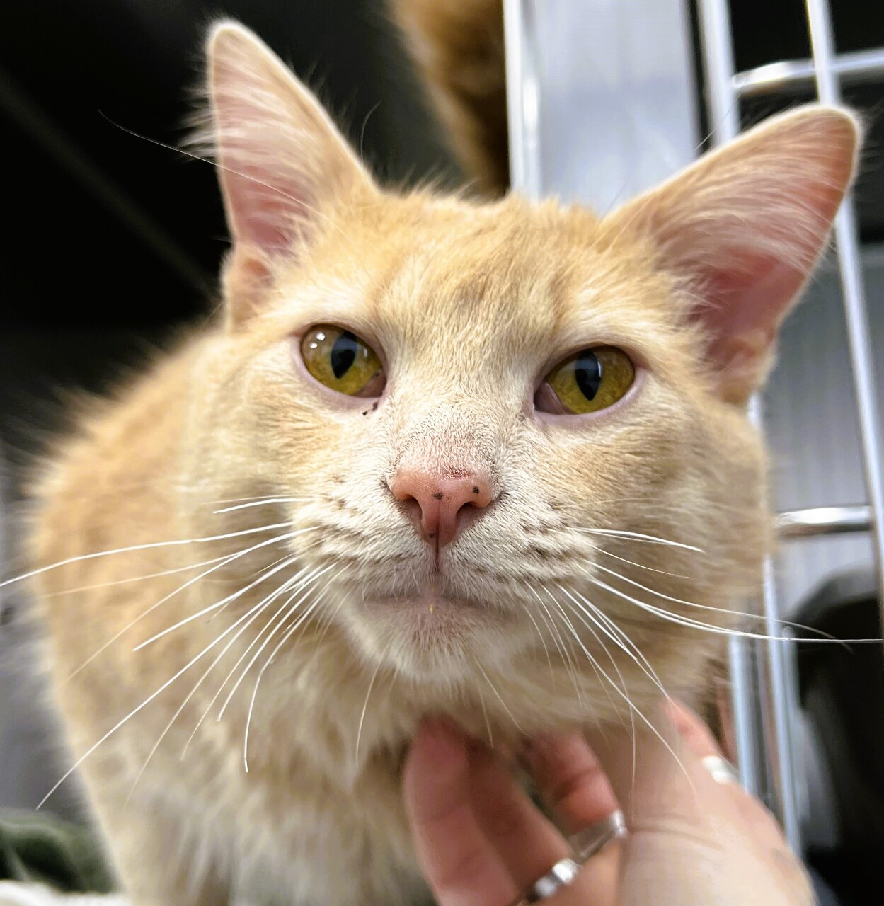 However, that's not how it is on the feline side of the equation. Other cats either scare him or interfere with his orange sensibilities, so we definitely suggest he gets adopted with a family that has had some experience in introducing cats. He is getting better with initially meeting a new feline, however, it's always better to be on the safe side.