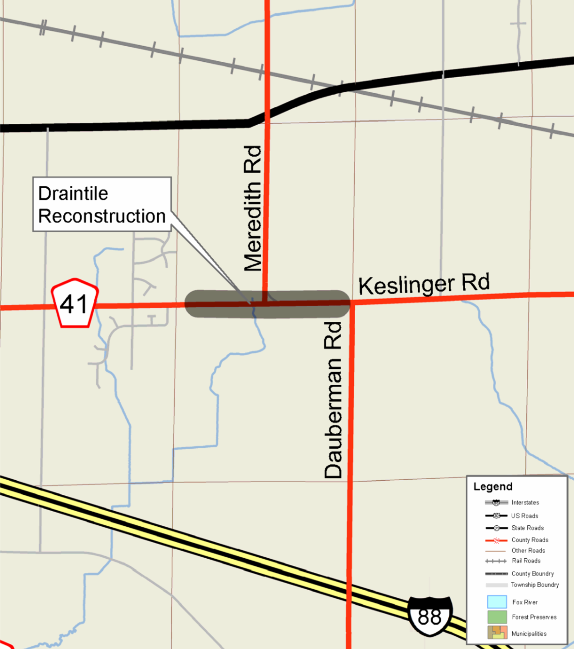 Drainage work is scheduled to begin the week of July 10th on Keslinger Road 300 feet west of Meredith Road in unincorporated Kane County. The anticipated duration for the work is approximately 3 weeks, weather permitting. The work shall consist of installing new storm sewer around the existing culvert to bypass the draintile that is damaged. The work will also include trenchless installation of storm sewer underneath Keslinger Road, construction of new manholes and erosion and sediment control aspects. In order to complete this work safety and efficiently, Keslinger Road may at times have temporary daily lane closures with flaggers throughout the duration of the project. Motorists are asked to please follow the posted signage and expect additional time added to their commutes.