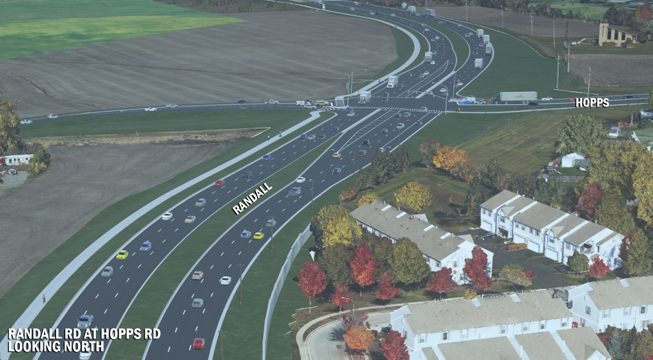 When completed, motorists will be able to drive over the Canadian National railroad tracks on Randall Road and Hopps Road. A north-south third lane will be added in both directions on Randall Road to ease traffic flow and reduce traffic delays.
