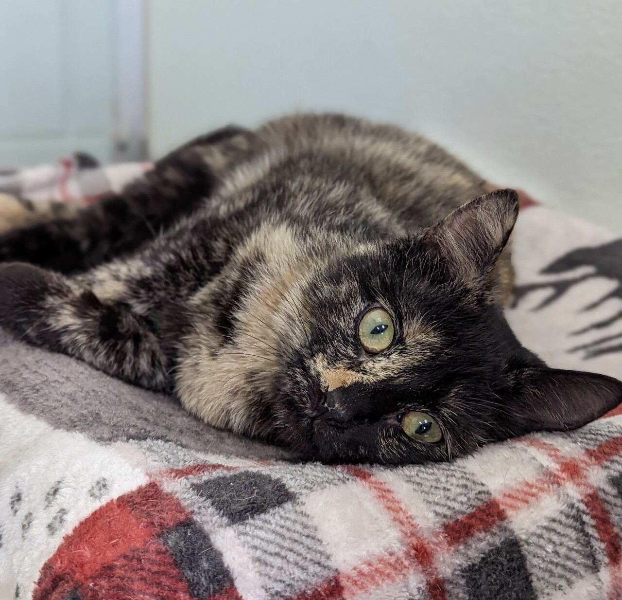 She…is a Domestic Shorthair that wears a tortoiseshell coat, which is why she's called Tortellini. Tortie for short, of course, which is her coloring, not her breed. The black and orange fur with her large yellow eyes gives her an air of mystery, as though she holds secrets to another world, a world where felines thrive and prosper and none become strays.