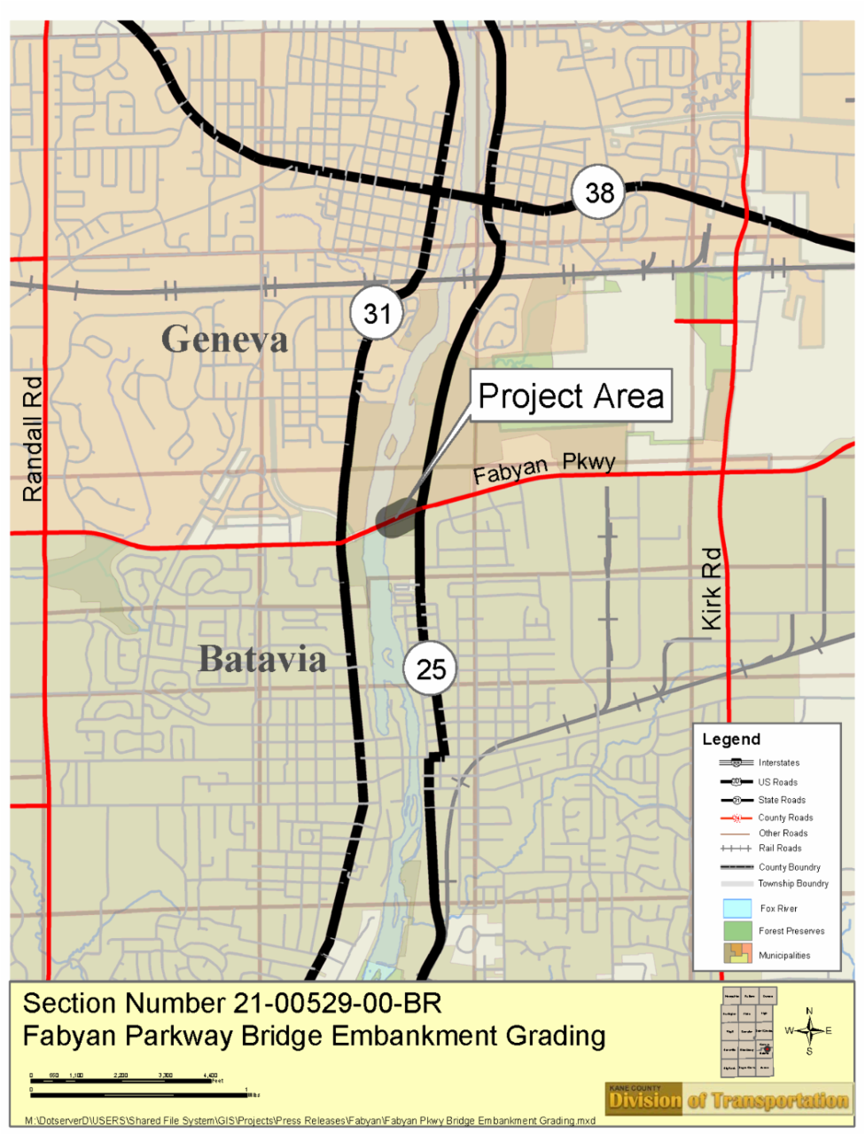 Embankment and bridge work underneath the Fabyan Parkway Bridge over the Fox River will begin the week of Monday, April 3rd, weather permitting, with working hours from 7:00 am to 5:00 pm Monday thru Saturday.