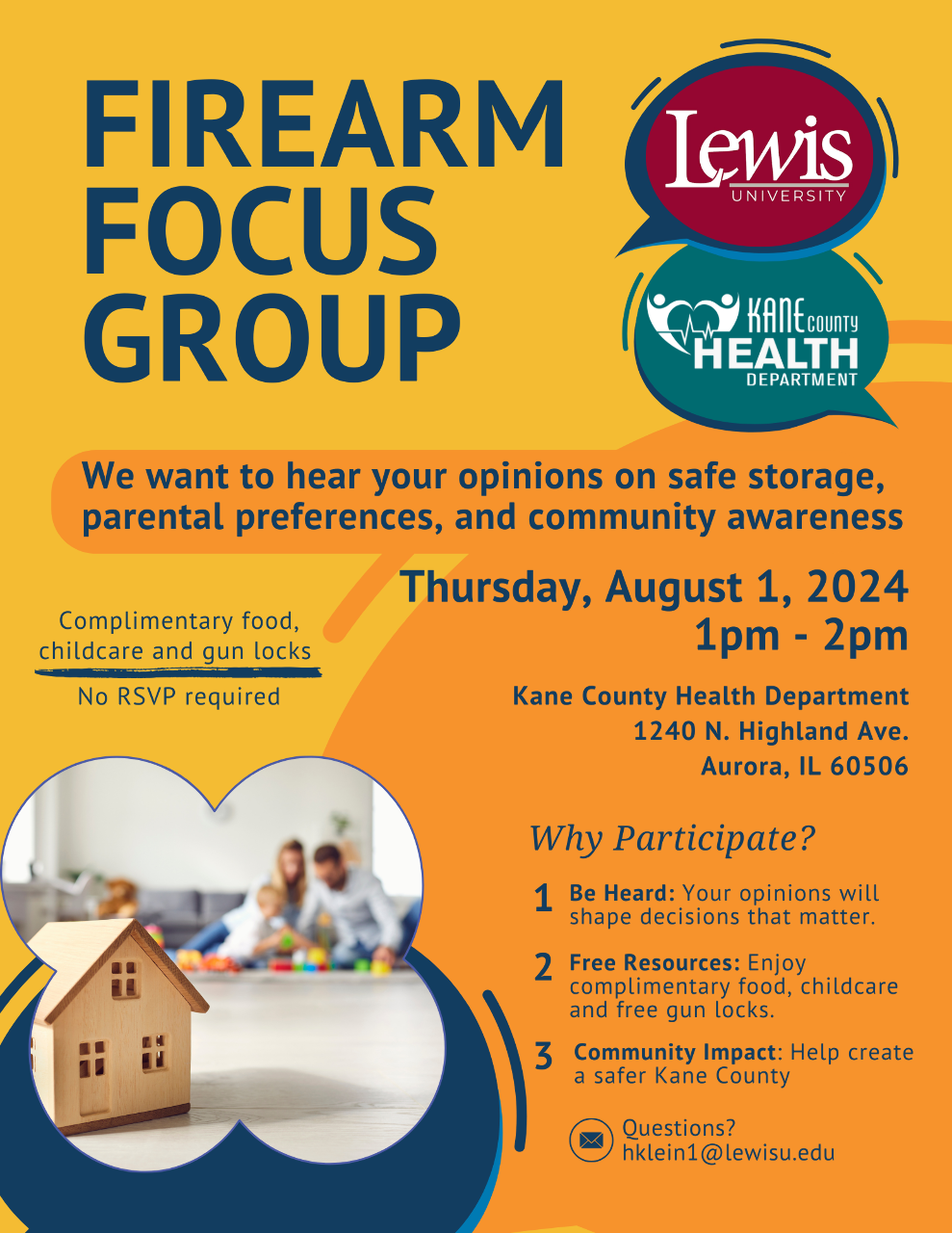Residents are invited to the Kane County Health Department to participate in Lewis University's focus group, where they can share their thoughts on safe firearm storage, parental preferences, and community awareness.
