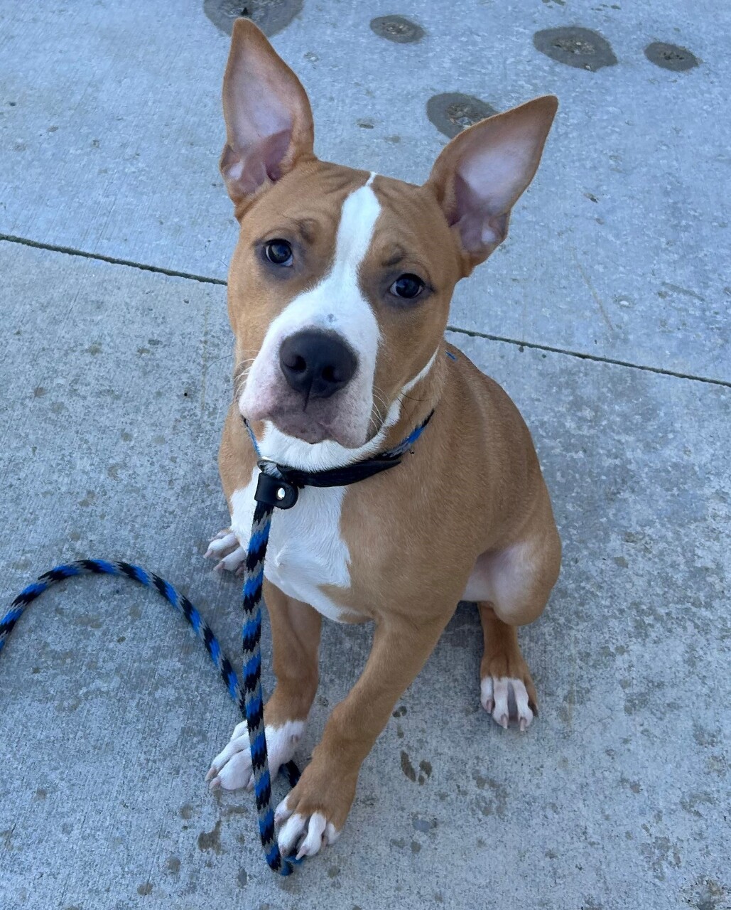 His name is Baxter and he's a 7-month-old brown and white, neutered pit bull found as a stray. He's just so doggone cute, especially when his ears seem to have a life of their own. Sometimes they decide to stand straight up and then, just as suddenly, they disappear, lying close to his head, making him appear totally “earless."