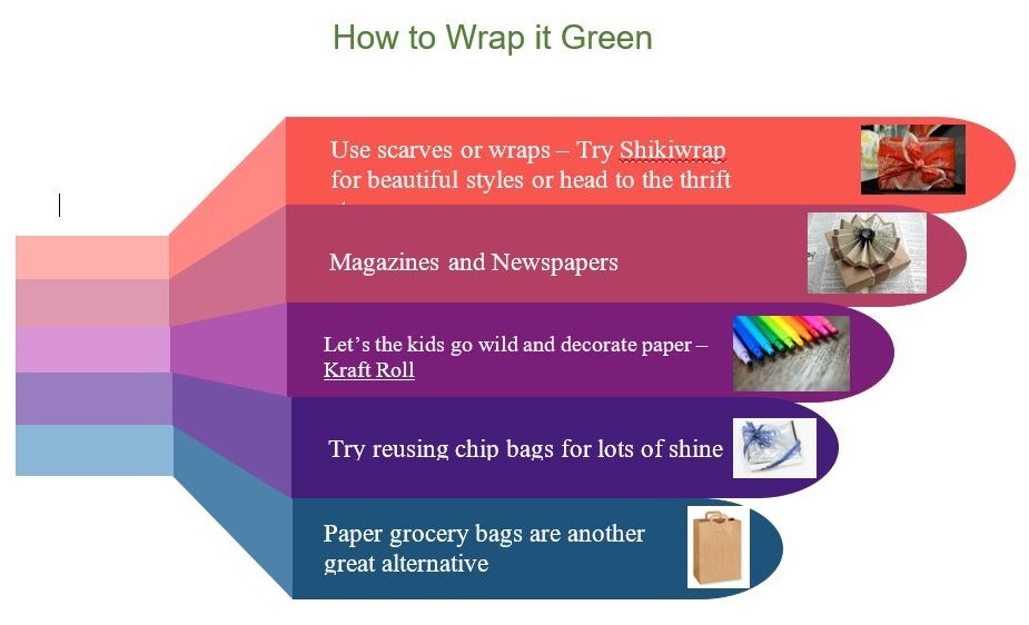 With the holiday's right around the corner, it is a busy time of the year as well as a wasteful one. It is estimated that in the US, 2.3 million pounds of wrapping paper each year ends up in landfills. Did you know that many types of wrapping paper can't be recycled? Many of us love all the metallic foil or and glittery paper for the holidays. Unfortunately, this paper cannot be recycled, along with any paper lined with plastic, tissue paper, or any wrapping paper bearing bows, ribbons. When these non-recyclable items are sent to recycling facilities, they can become tangled in equipment (ribbons) or contaminate bales of higher quality paper (tissue paper, glitter, foil paper). A lower impact option is to go for sturdy/high quality gift bags instead of wrapping paper and then use the same bags over and over for several years. If you're crafty, there are also numerous alternatives to traditional gift wrap that may speak to your artistic side.
