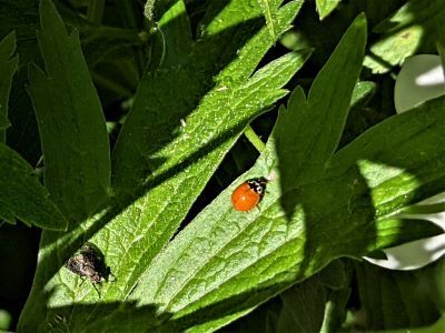 As I was observing the lady beetle and trying to determine if it was indeed an actual native species, a fly landed nearby and started what I like to think of as handwashing—rubbing first its forelegs, then its hindlegs together as a means of cleaning off whatever debris its little fly feet had acquired. The lady beetle, immaculate as it was, saw no need to engage in such behavior and quickly scurried to the underside of the leaf.