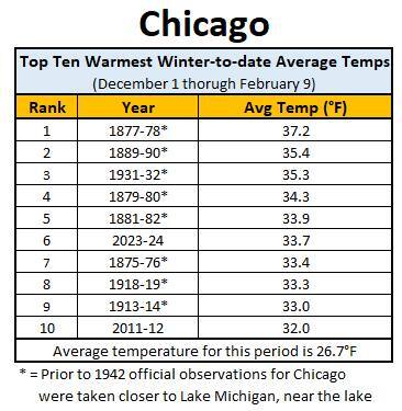 For Chicago, the five warmer winters-to-date occurred when observations were taken much closer to Lake Michigan, where temperatures tend to be milder compared to O'Hare or Midway airports during winter.