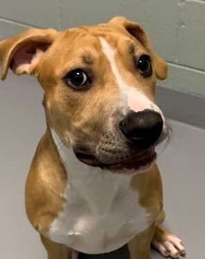 If Blue, a 5-month-old, neutered brown and white male Pit Bull terrier, could tell you his name he would, but he’s too busy wiggling his butt and asking for everyone in the room to pet him.