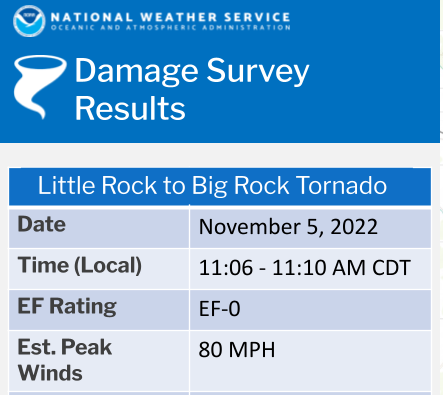 An NWS Damage Survey confirmed an EF-0 tornado with peak winds of 80 mph, path length of 3.7 miles, and maximum width of 100 yards touched down during the morning of 11/5/2022 near Big Rock, IL. The tornado was spawned by a thin line of showers along a cold front. Damage along the path of the tornado was characterized by downed trees and tree limbs, though the roof of a barn was damaged and at least one power pole was snapped.