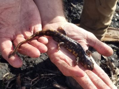 8. Salamanders are on the move. Each year the restoration ecologists at Hickory Knolls monitor the tiger salamander population in our natural area. Rain plus night-time temperatures above freezing bring these determined amphibians up from their subterranean lairs; then down, down they march toward the ephemeral ponds where they breed. We've counted over a dozen already, with many more to come.