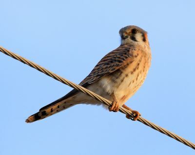 Raptors aren't really known for their striking color combinations, but the American kestrel is one notable exception. Striking combinations of gray blue and rust brown punctuated with black and white—with mature males having a skosh more color than females and immatures—catch your eye when the lighting is right. Should you be so lucky, look also for two vertical black bars (known as the moustache and sideburns) on the sides of the head of both sexes.
