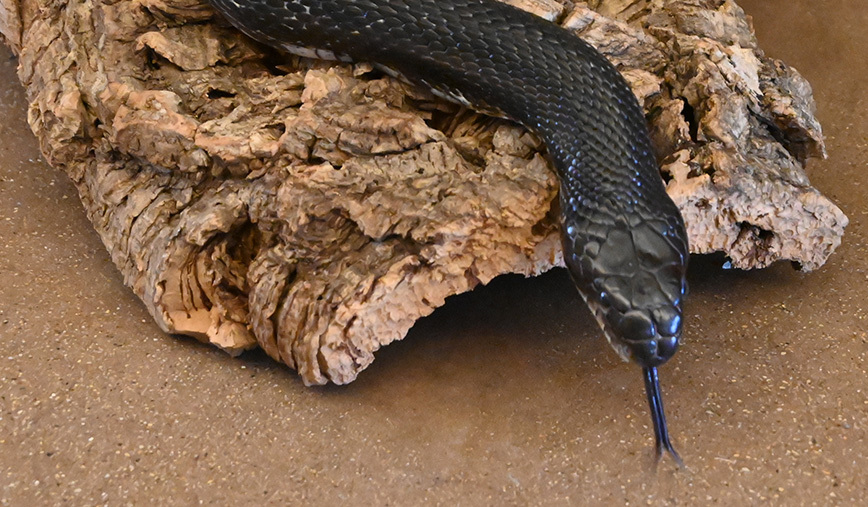 Even though his diet is somewhat tame, his feeding instincts are not. Gray ratsnakes aren't commonly sold in the pet trade and, as a result, captive individuals have retained many of their wild traits. Randy approaches every meal as if he were hunting in a downstate woodland—one of several natural habitats gray ratsnakes call home. (Although native to Illinois, Pantherophis spiloides does not naturally occur in Kane County.)